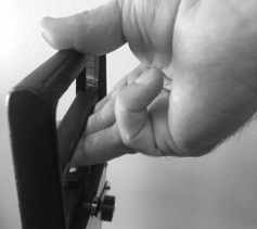 During the upper-limb power test, participants were asked to dead-hang with straight arms from two small holds that were approximately 2-3cm deep with a slight lip. Each hold was attached to a separate board, positioned approximately 45-50cm apart, that could freely slide in a bracket that was attached to a vertical wall. The bracket extended from the wall 3.5cm. A force transducer (MLP-300; Transducer Techniques, Rio Nedo Temecula, CA) was attached to the board with an inelastic strap, allowing the force that the participant exerted on the hold to be measured with the force transducer (Figure 2).