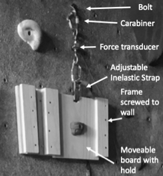 Figure 2. Force measurement system and experimental setup. The hold was mounted on a board that was placed between two frames that allowed the board to freely slide. The board was then attached to an inelastic strap which was connected to a force transducer. The force transducer was clipped to a bolt by a carabiner to mount the hold to the wall.