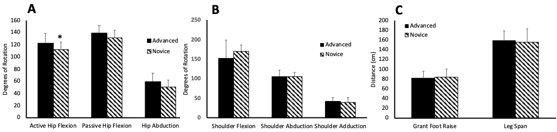 Figure 3. Mean ± SD flexibility measurements for advanced and novice for hip (A), shoulder (B), and climbing specific (C) flexibility measures. Significant differences between flexibility tests are shown (* p < 0.05).