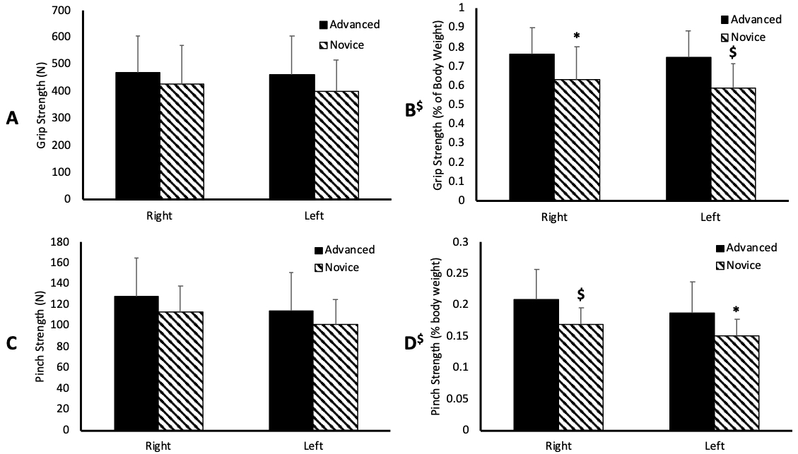 Figure 4. Mean ± SD grip strength (A), grip strength normalized for body weight (B), pinch strength (C), and pinch strength normalized for body weight (D) measurements for advanced and novice. Significant differences for grip strength tests are shown (* p < 0.05, $ p < 0.01, & p < 0.001).