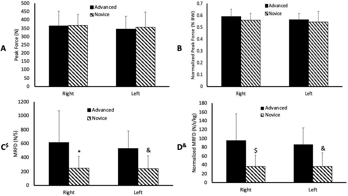 Figure 5. Mean ± SD peak force (A), normalized peak force (B), maximum rate of force development (C), and normalized maximum rate of force development (D) for advanced and novice. Significant differences for grip strength tests are shown (* p < 0.05, $ p < 0.01, & p < 0.001).